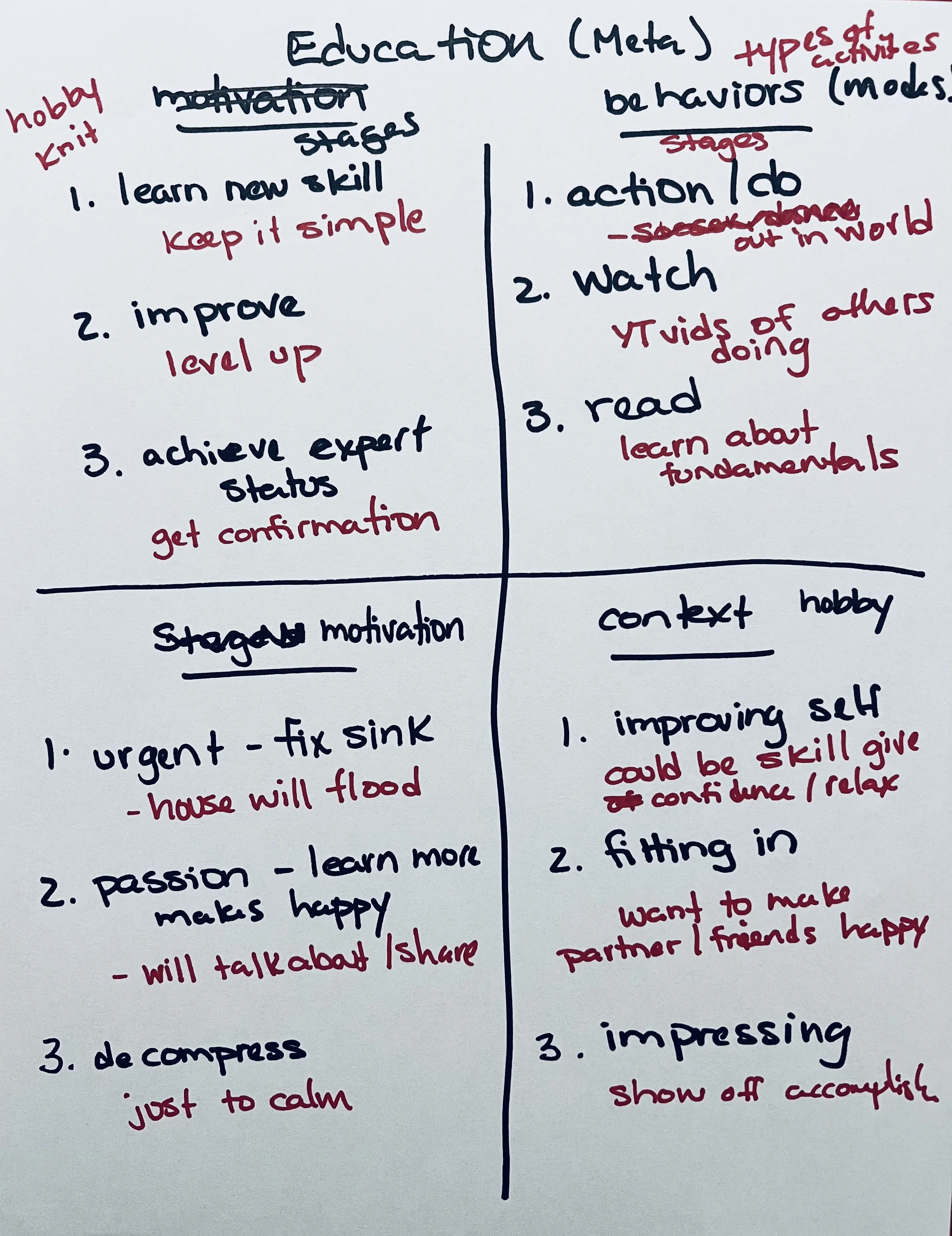 After you finish a mock but before you move on to the next thing or case, take a piece of 8.5 x 11 paper and put a 4 box grid on it. In each box write 3 different user segmentations for the case you just did.